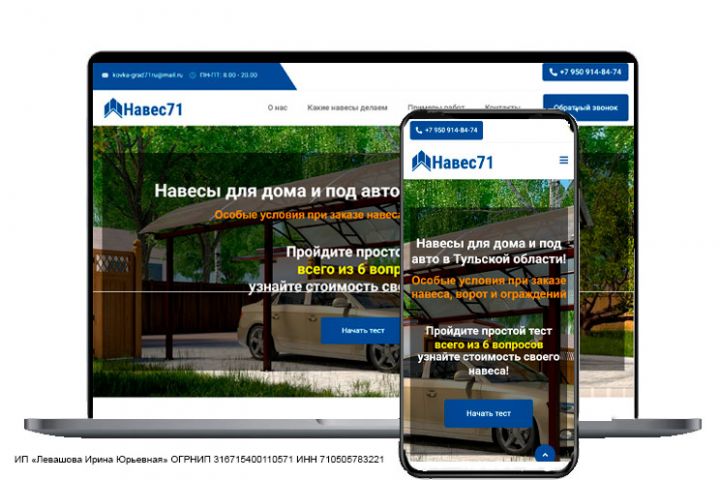 В начале этого года мы создали небольшой одностраничный сайт по изготовлению навесов в Туле и области с квизом — удобным сервисом вопрос-ответ для получения более подробной информации по заказу.