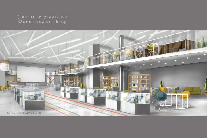Визуализация офиса продаж выполнена в виде скетча, все детали по ТЗ учтены