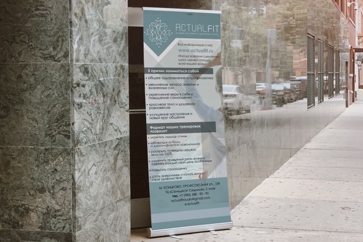 Дизайн для RollUp. Для студии растяжки и йоги. Нейтральные, спокойные, несколько холодные тона эмоционально снижают тревогу и страх перед началом новой деятельности (для новичков в спорте), и привлекают посетителей не только молодого, но и старшего возраста