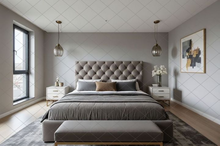 Сцена как Modern Luxe Suite: мягкая кровать king (изголовье с каналом), тумбочки с мраморной столешницей, подвески из дымчатого стекла, абстрактное искусство над кроватью, скамья на краю, многослойные ковры, цельная палитра.