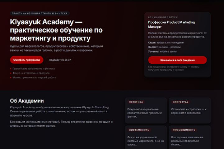 Klyasyuk Academy превратилась в образовательный продукт, а не просто лендинг.