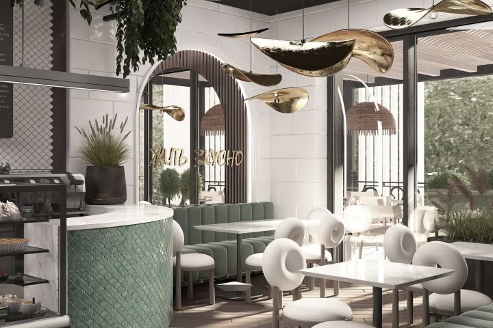 Задача была создать жизнерадостный интерьер кафетерия и летней площадки к нему.
