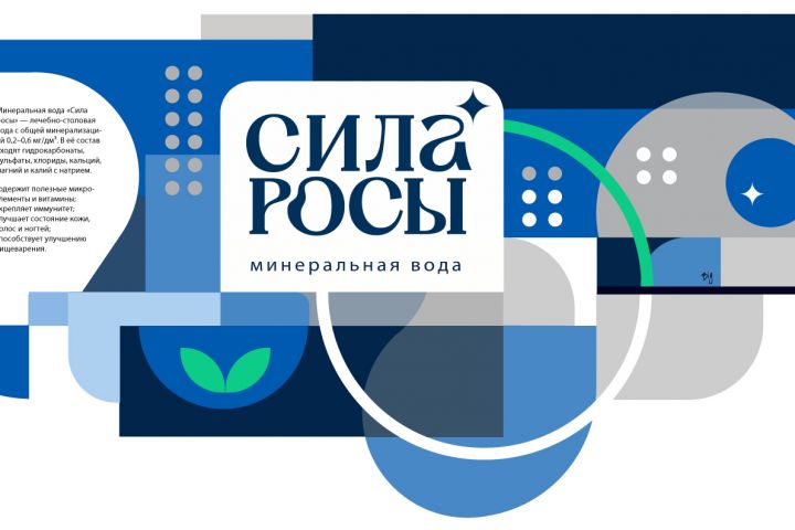 Фоновая графика состоит из геометрических модулей: круги, сегменты, прямоугольники и динамичные линии образуют визуальный поток, напоминающий движение воды, минерализацию и природные процессы.