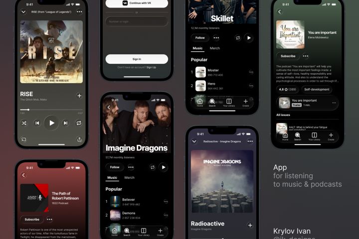 Клиенту требовался современный интерфейс для мобильного приложения, объединяющего музыку, подкасты, подборки артистов и рекомендации. Основная цель — создать стильный, тёмный, премиальный UI с удобной навигацией и цельной визуальной системой.