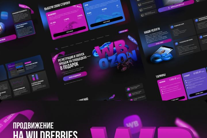 Мы создали яркий, дерзкий и запоминающийся лендинг, подчёркивающий динамику и конкурентность работы на маркетплейсах. Визуальная айдентика построена на неоновых цветах, 3D-образах и контрастных акцентных элементах — это усиливает ощущение движения, масштаба и экспертности. Структура страницы помогает быстро объяснить услуги, выгоды и сценарии сотрудничества, направляя пользователя к оформлению заявки.