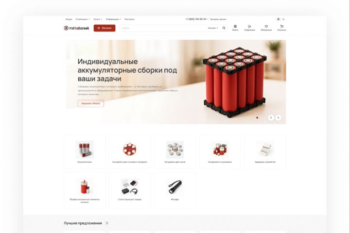 Мы разработали чистый, функциональный и максимально практичный интерфейс для онлайн-витрины аккумуляторов и комплектующих. Дизайн основан на светлой модульной сетке, аккуратных карточках товаров и продуманной структуре каталогов — пользователь быстро ориентируется в большом ассортименте и сразу видит ключевые характеристики. Главная страница усиливает доверие через бренды-партнёры, блок преимуществ и короткое приветственное описание компании.