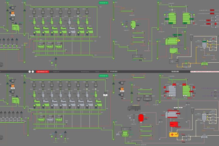 Автоматизация технологических процессов маслоэкстракционного завода, реализованы работы двух цехов по двум очередям: рушально-веечного и маслопрессового. SCADA располагается на 4 мониторах fullHD.