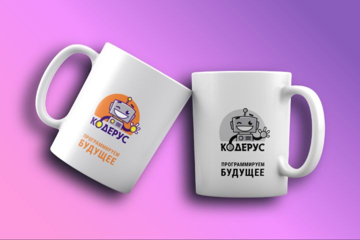 Брендирование кружки с использованием логотипа и слоганом школы программирования «Кодерус». Разработана реалистичная 3D-визуализация для презентации концепции.