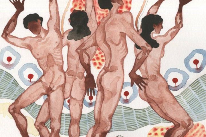Задачей проекта было: создать уникальный паттерн с повторяющимися элементами и включая этот паттерн нарисовать иллюстрации, на которых изображены люди в движении, в традиционной технике (акварелью).