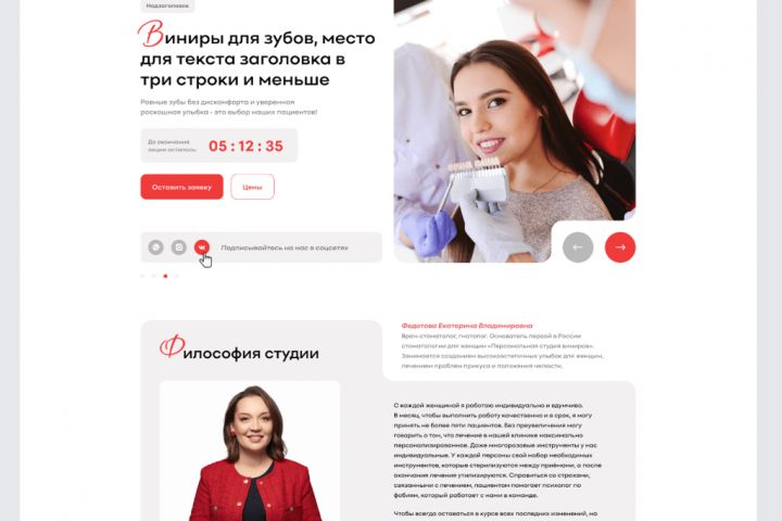 Мы создали светлый и спокойный интерфейс, который помогает пациентам почувствовать доверие и уверенность перед лечением. В дизайне использованы мягкие оттенки, аккуратная типографика и тёплая подача врача, подчеркивающая персональный подход клиники.