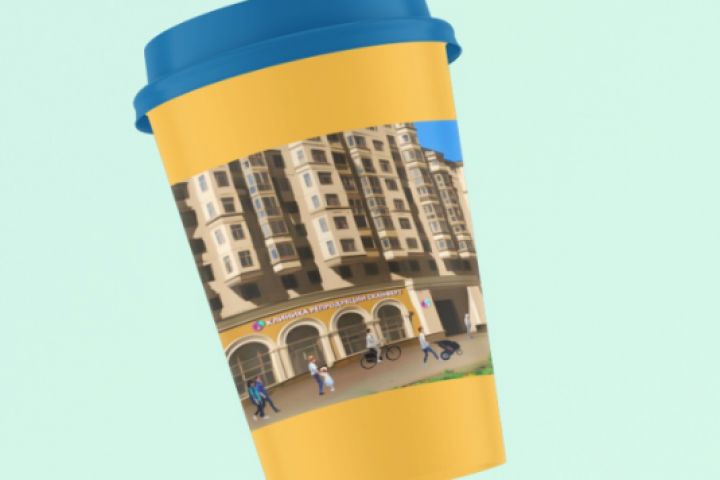 Для стаканчика кофе отрисовал здания офиса по фотографии, дорисовал дополнительно людей и часть других элементов.