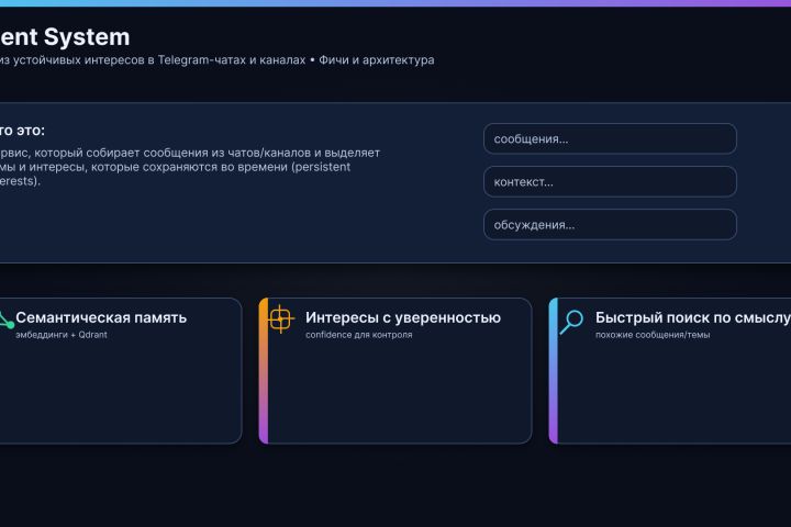 несколько микро-сервисов, которые агрегируют сообщения с каналов в базе (и умеет присоединятся к каналам), сервис препроцессинга сообщения, совершающий эмбеддинг (для экономии запросов к LLM и фильтрации пустых сообщений), сервис, обращающийся к LLM и сохраняющий интересы в базе данных