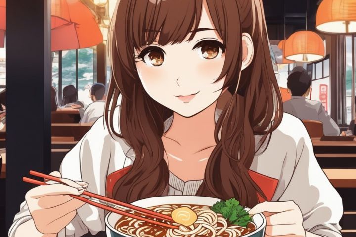 Арт аниме девушки кушающей рамен в Токийском кафе.