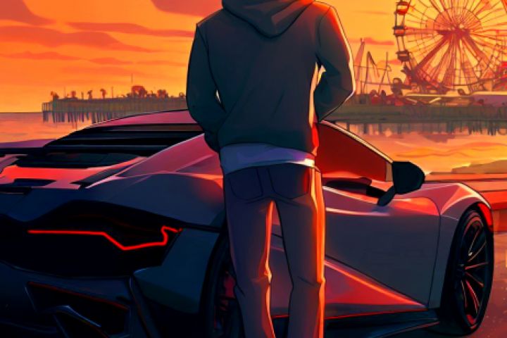 Клиент просил нарисовать в стилистике близкой к GTA 5 спорткар около которого стоит персонаж в худи + с парком аттракционов который находится на другом берегу.