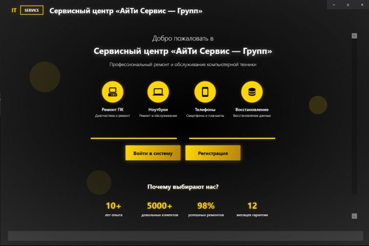 Сервисному центру «АйТи Сервис — Групп» требовалась автоматизация учёта заказов на ремонт. Работа велась в бумажных журналах и Excel-таблицах, что приводило к путанице, потере заявок и сложностям в отслеживании статуса ремонта для клиентов. Задача: создать внутреннее веб-приложение, которое позволит мастеру быстро зарегистрировать заказ, назначать статусы («Принят», «В работе», «Готов», «Выдан»), хранить историю и формировать простые отчёты, а клиентам — по номеру телефона или ID узнавать текущий статус своего ремонта.