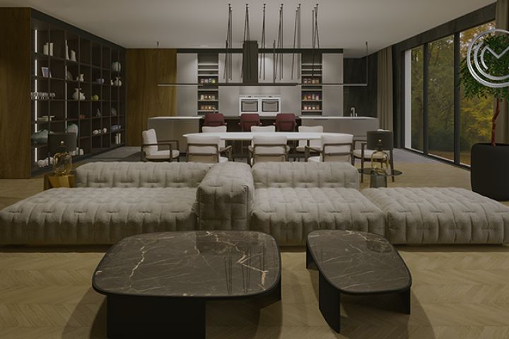 Гостиная это место для общения и совместного времяпрепровождения. Панорамные окна с гостиной создают впечатление, что находишься прямо в лесу. Гостиная соединена с кухней, столовой и баром, создавая единое пространство для отдыха и общения