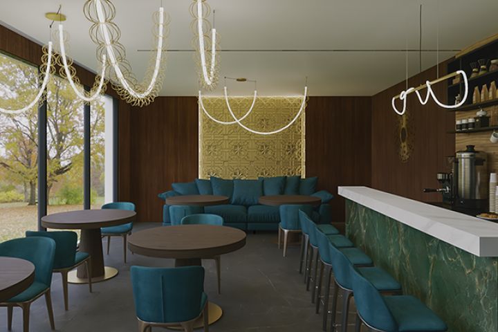 Торговый зал в кафе отделан материалам с текстурой дерева. Это создает теплую атмосферу в помещение для отдыха и общения.