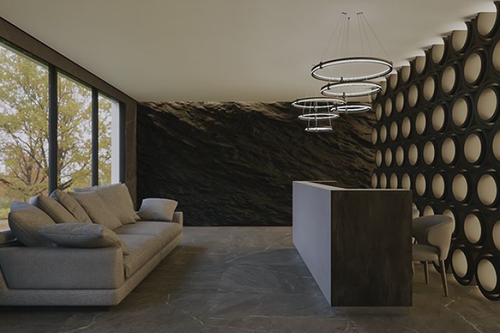 Лобби с большими окнами. Это позволяет проникать большому количеству естественного света. Разная объемная отделка стен с подсветкой делает помещение уютным и обволакивающим.
