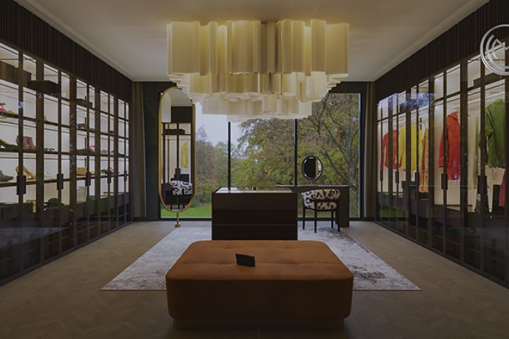 Просторная гардеробная с большими окнами, что позволяет проникать большому количеству естественного света, усиливая связь с природным окружением.