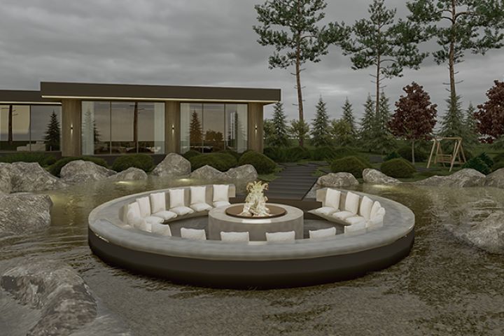 Проект, представляющий собой слияние 4 элементов: воды, земли, воздуха и огня. Соединены в едино - современный архитектурный дизайн с природным ландшафтом.