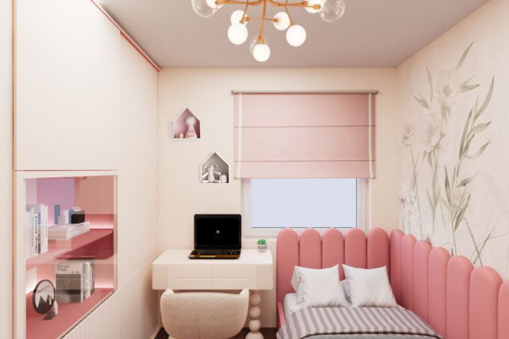 На основе технического задания разработали дизайн-проект и фотореалистичную визуализацию детской комнаты в уютной палитре розовых и светлых оттенков.