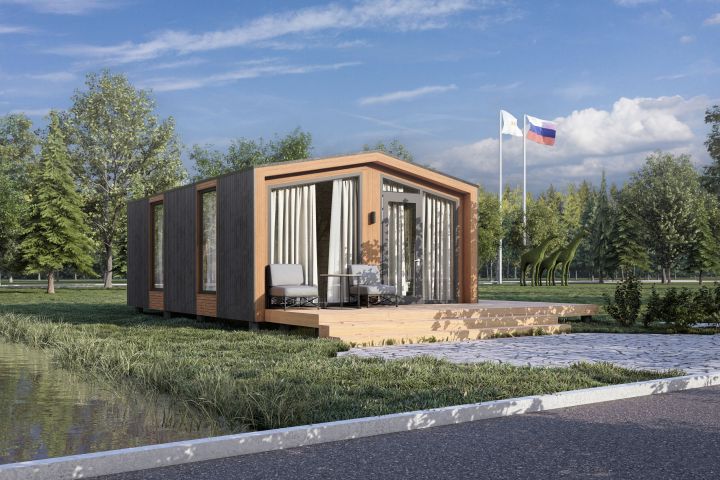 Созданы фотореалистичные визуализации компактного модульного дома в современном эко-стиле.
