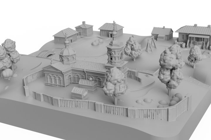 Модель представляет собой диораму, художественно воссоздающую рельеф и главные архитектурные доминанты села в миниатюре. Масштаб был выдан таким образом, чтобы сохранить высокий уровень детализации, оставаясь в пределах печати на настольном 3D-принтере с возможностью последующей сборки.