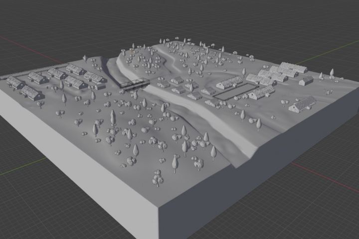 Подготовка к печати: Общая сцена была разбита на логические блоки: ландшафт, здания, техника. Для каждого элемента была подобрана оптимальная ориентация на столе и настроены параметры поддержек для сложных геометрий.