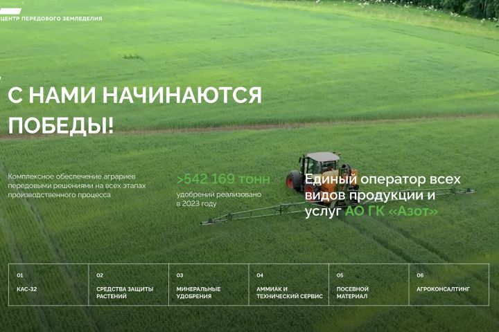 Главная страница выполняет роль краткой презентации компании, которая формирует первое впечатление, задаёт тон всему последующему взаимодействию. Каждый элемент тщательно выверен и работает на общую цель — позиционирование «Центра передового земледелия» как надёжного партнёра для аграриев в сфере растениеводства.