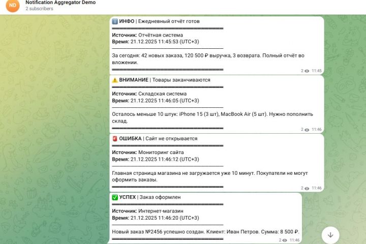 • Интуитивно понятный канал: Все сообщения приходят в один Telegram-канал с цветовыми метками: зелёные (всё хорошо), красные (ошибка), жёлтые (внимание), синие (информация). Видно сразу, что случилось, от какого сервиса и когда.