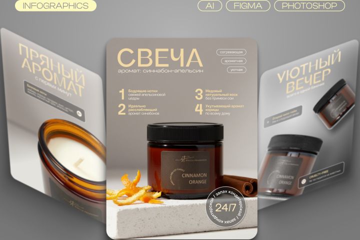 Разработать минималистичную и цепляющую инфографику для восковых ароматических свечей с нотами синабона и апельсина.
