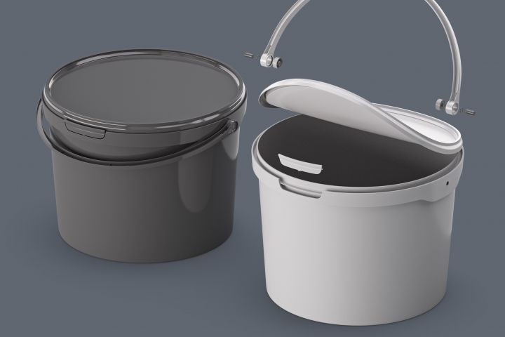3д модель пластикового ведра, предназначенного для розлива лакокрасочных материалов. Средне-высокая степень детализации.