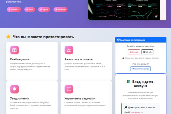 - Реализован базовый CRM-функционал: управление контактами, компаниями, сделками, задачами
