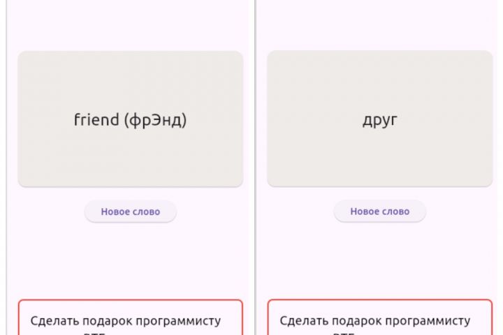Приложение для заучивания английских слов. При нажатии кнопки «Новое слово» на экране появляется одно из тысячи частотных слов с русской транслитерацией. На обратной стороне карточки перевод. Работает как в англо-русском, так и в русско-английском режиме. Необходимо лишь перевернуть карточку нужной стороной. Добавлена функция копирования номера карты для донатов. Скачать приложение можно тут: