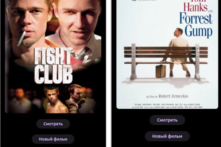 Приложение для просмотра фильмов. При нажатии кнопки «Новый фильм» рандомно выдает пользователю фильм. Повторный клик демонстрирует новую афишу. Кнопка «Смотреть» открывает фильм в плеере на другом экране. Файлы загружены в хранилище Supabase.