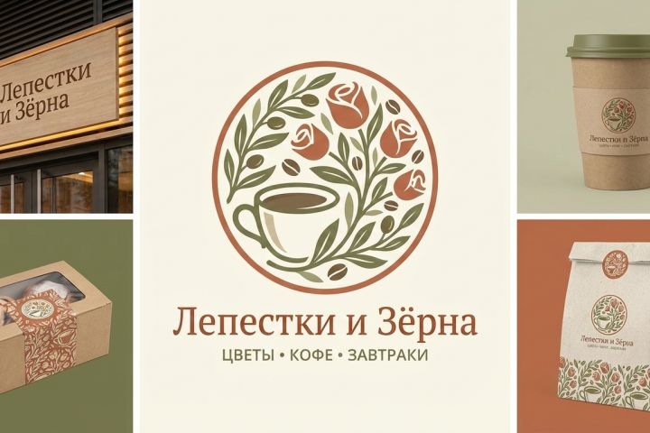 Разработать логотип для цветочного магазина и кофейни с кухней (один совместный проект в одном помещении). Название в логотипе "Лепестки и Зёрна". В кофейне различные десерты, напитки и кухня с завтраками и простое меню (бранчи).