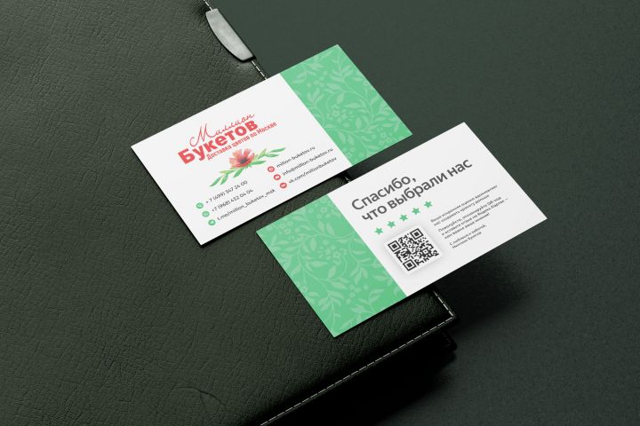 Разработать двустороннюю визитную карточку для службы доставки цветов, работающей в Москве. Цель — создать запоминающийся, элегантный и функциональный дизайн, который будет отражать утончённость бренда, его связь с природой и вниманием к деталям. Важно было разместить контактную информацию, соцсети, QR-код и благодарственное сообщение — всё в едином стиле, легко читаемом и приятном на ощупь.
