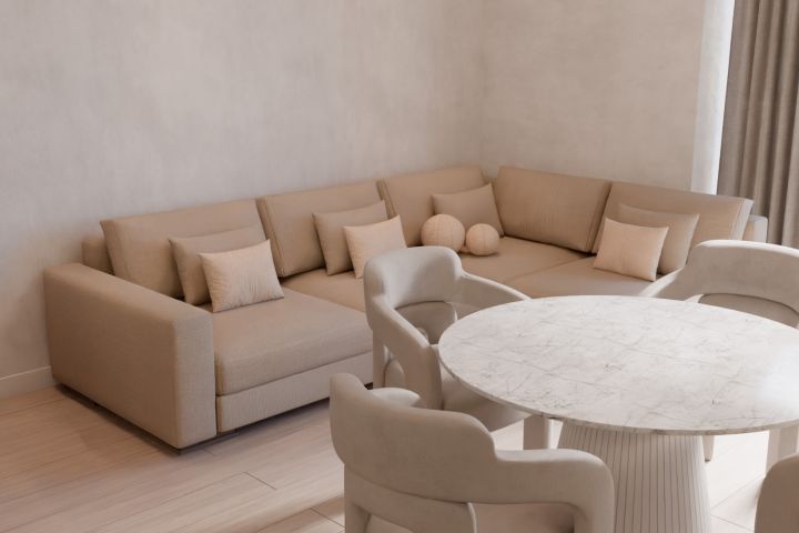 Был разработан современный интерьер в светлой палитре с тёплыми древесными акцентами, создающими ощущение уюта, мягкости и визуального баланса.
