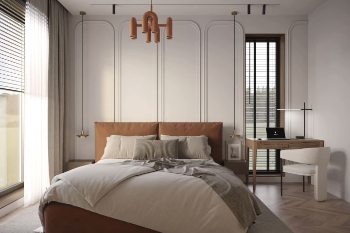 Спальня с яркой кроватью в современном стиле