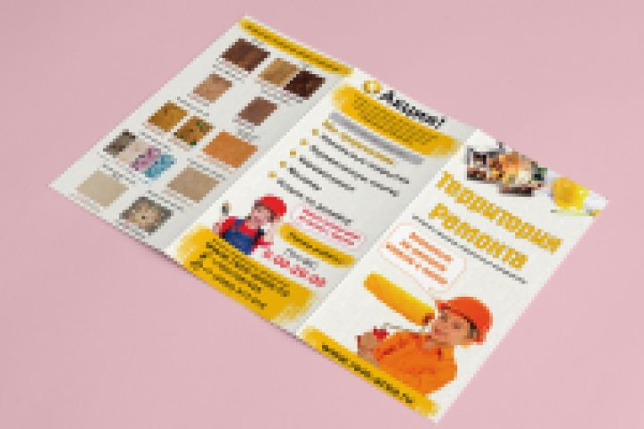 Евробуклет для интернет-магазина отделочных материалов. Внутри буклета перечень образцов материалов с ценами.