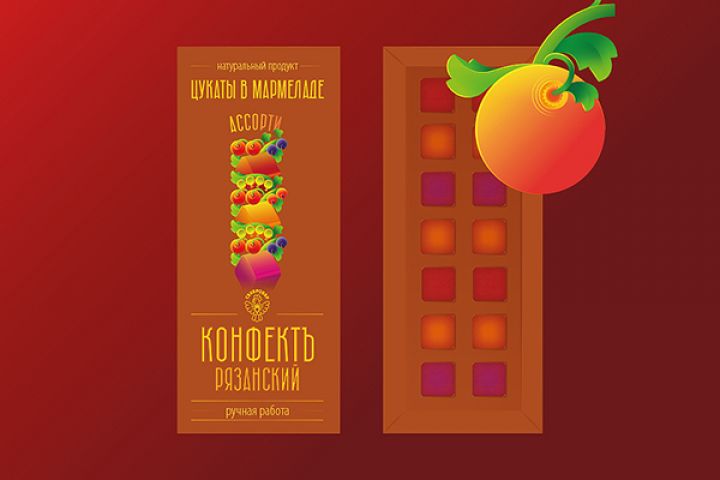 Разработать упаковку для мармелада Конфектъ Рязанский, которая выпускает Рязанская сахарная мануфактура Сахаровар. Сделать акцент на то, что этот продукт сделан по старинному рецепту матери Петра I.