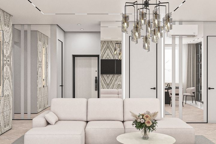 Задача стояла сделать большое пространство для приема гостей и во второй части - жилое пространство для хозяев квартиры. мастер-спальня с гардеробной и своей ванной. предусмотреть гостевую комнату (как будущую детскую). И предусмотреть рабочую зону на балконе.
