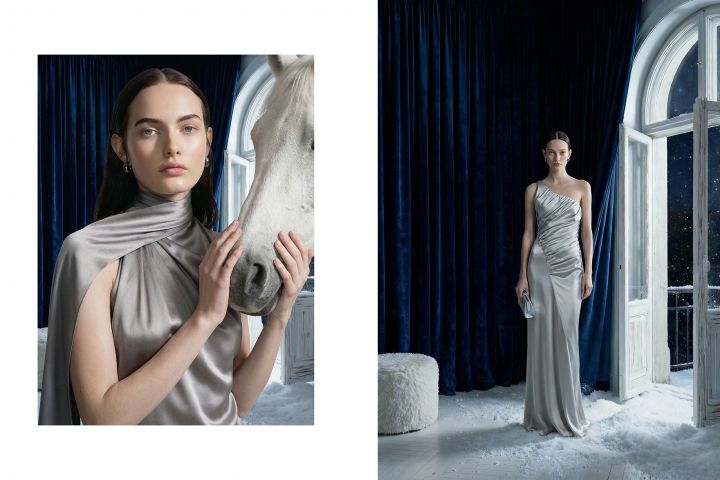 Создать новогодний лукбук вечерних платьев на моделях, с атмосферой зимней сказки, сохранить реалистичность одежды.