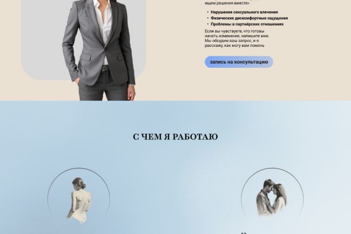 - Главная — лаконичное представление эксперта + кнопка «Запись на консультацию».