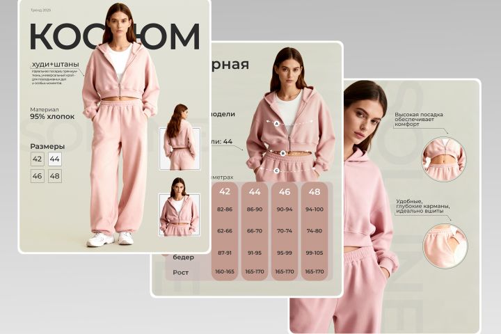 Задача: создать карусель из 3 слайдов для женского спортивного костюма, включая один слайд с чётко оформленной размерной сеткой. Основные слайды должны демонстрировать костюм на модели в нейтральной позе на светлом фоне, подчёркивая крой, текстуру ткани и цвет. Все слайды в минималистичной, премиальной эстетике.