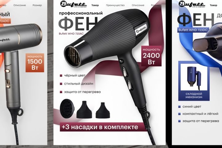 Задача: Разработать инфографику для фенов в едином стиле для бренда Bufett на Яндекс/Маркет