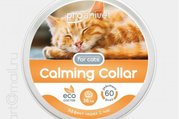 Дизайн этикетки успокаивающего ошейника для кошек под брендом proanivet, который начинает действовать через час, имеет экологичный состав, длину 38 см и обеспечивает эффект в течение 60 дней.