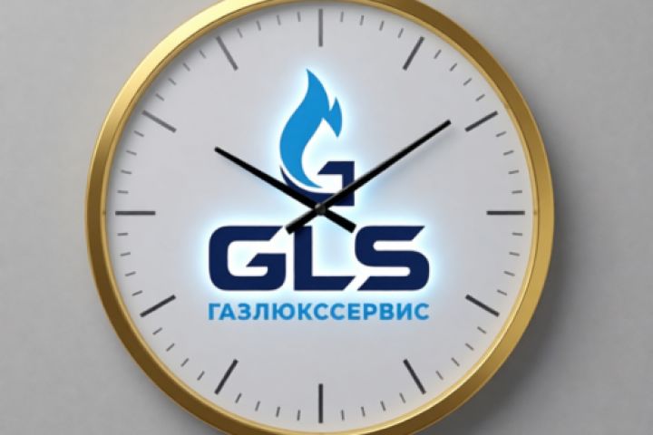 Современные настенные офисные часы с белым матовым циферблатом. На циферблате четко нанесены арабские цифры черного цвета в современном шрифте. В центре или верхней части расположен логотип GLS «Газлюкссервис» с голубым пламенем. Логотип имеет мягкую внутреннюю LED-подсветку, излучающую деликатное голубое свечение. Тонкие металлические стрелки черного цвета. Часы висят на стене в светлом офисном интерьере. Фотореалистичный дизайн, высокое качество, профессиональный рендер.