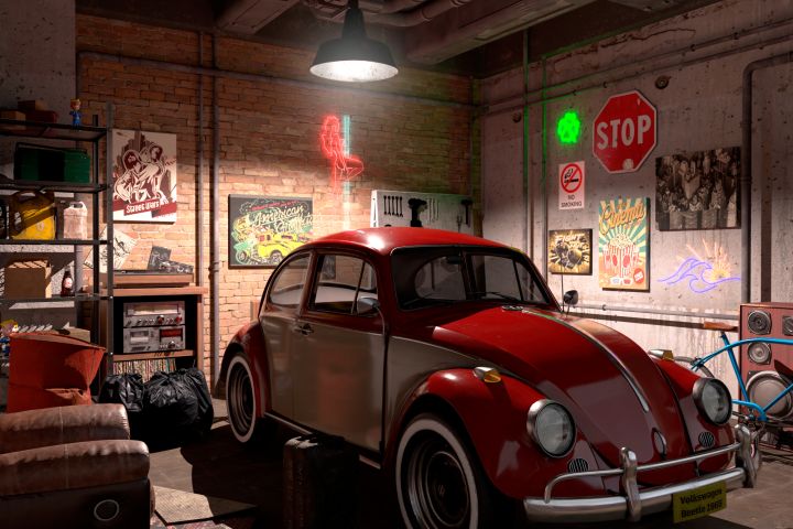 Клиент обратился с запросом на создание детализированной 3D-сцены в стилистике ретро-гаража с атмосферой уюта и ностальгии. Основной задачей было визуально передать характер пространства, в котором сочетаются винтажный автомобиль, неоновый свет, элементы городской культуры и индустриальный интерьер. Сцена должна была выглядеть кинематографично, реалистично и при этом иметь художественный стиль, подходящий для презентаций, обложек, баннеров или концепт-арта.