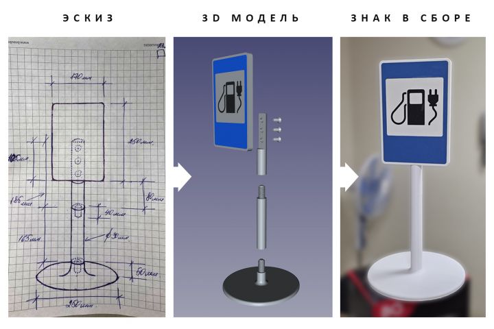 Требовалось создать CAD-модель дорожного знака для дальнейшей печати на 3D принтере. Особенность состояла в том, что область печати принтера была ограничена объёмом 250х250х250 мм, поэтому знак должен был состоять из частей. Заказчик предоставил эскизный чертёж с размерами каждой составной части. Все технические стороны оставались на мне - размеры резьб, зазоры и т.д.